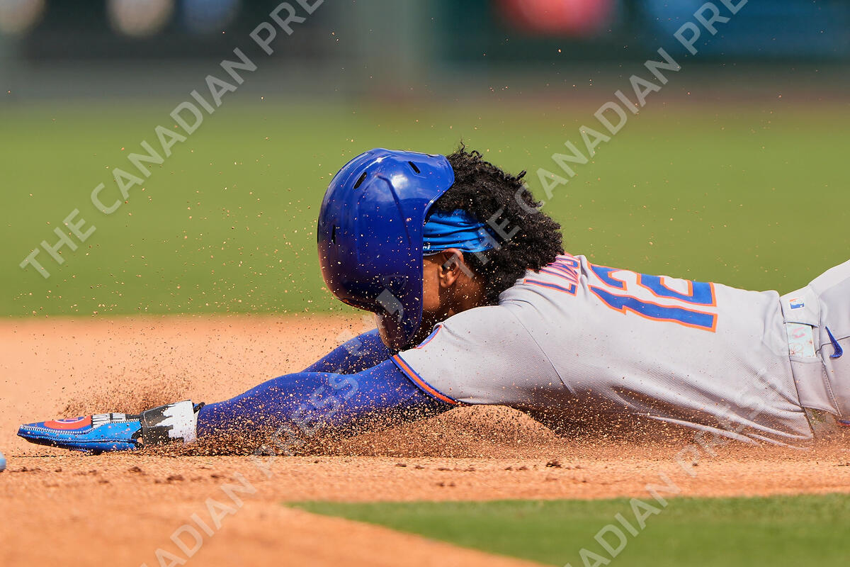 New York Mets' Francisco Lindor steals second during the fourth inning of a baseball game against the Kansas City Royals, Saturday, July 12, 2025, in Kansas City, Mo. (AP Photo/Charlie Riedel)