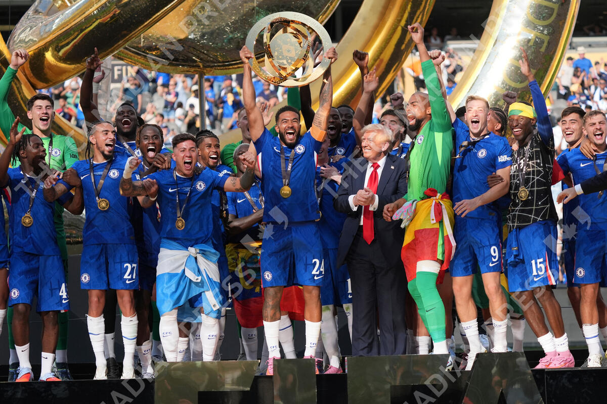 President Donald Trump, sixth from right, watches as Chelsea's Reece James (24) lifts the trophy following the Club World Cup final soccer match between Chelsea and PSG at MetLife Stadium in East Rutherford, N.J., Sunday, July 13, 2025. (AP Photo/Jacquelyn Martin)