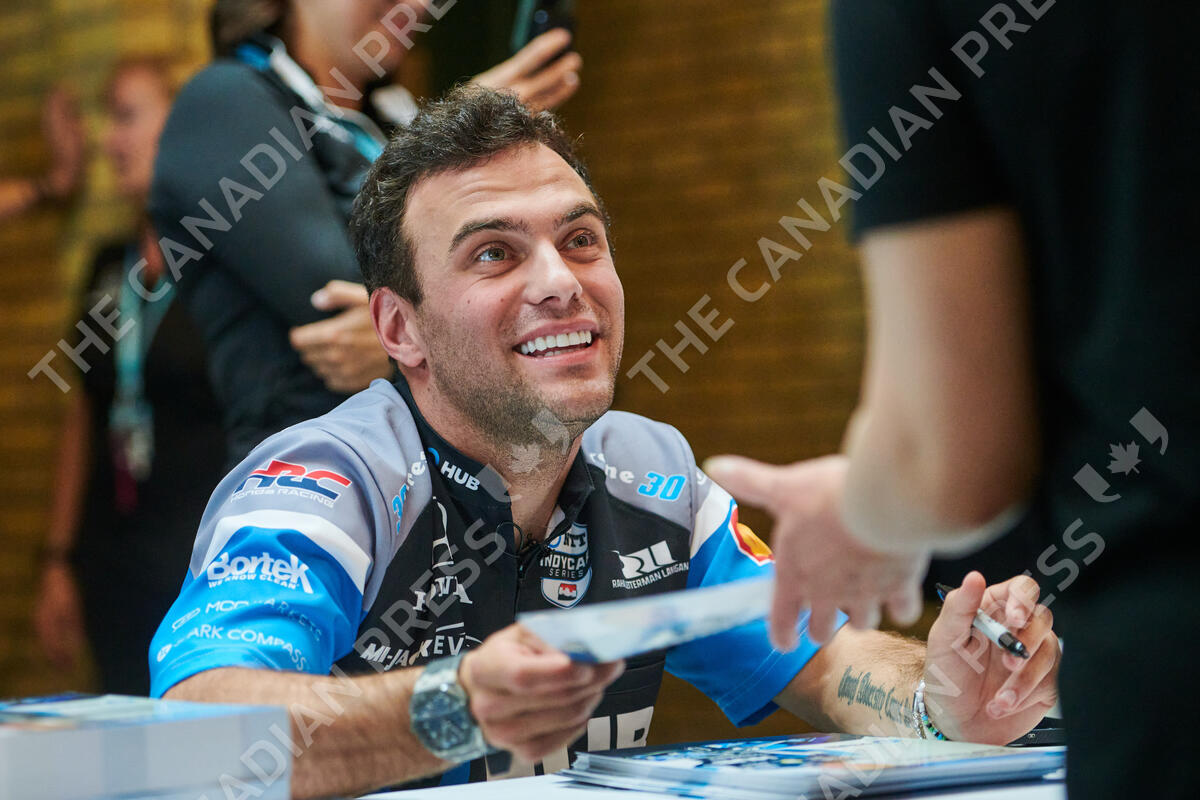 Devlin DeFrancesco, of Canada, signs cards for fans ahead of the 2025 Honda Indy in Toronto on Friday, July 18, 2025. THE CANADIAN PRESS/Sammy Kogan