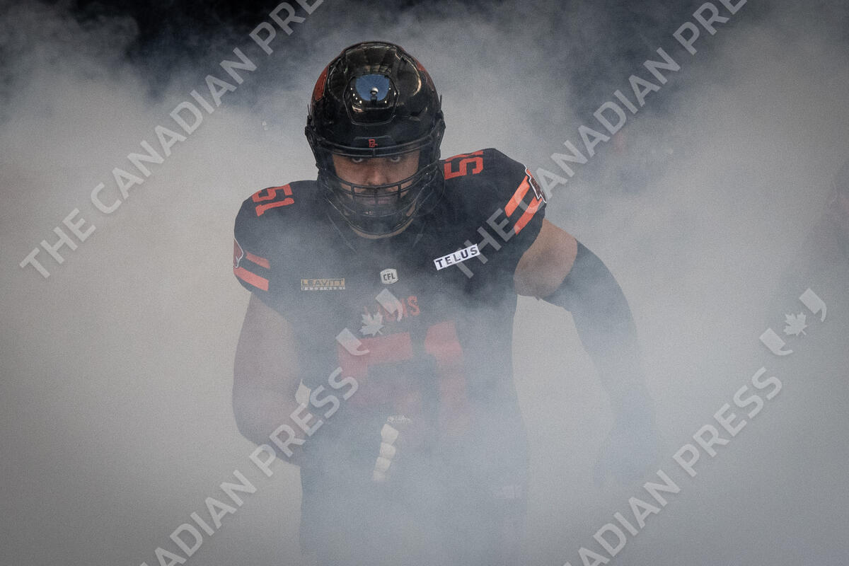 B.C. Lions' Michael Couture runs onto the field before the first half of a CFL football game against Edmonton Elks in Vancouver, on Saturday, June 7, 2025. THE CANADIAN PRESS/Ethan Cairns