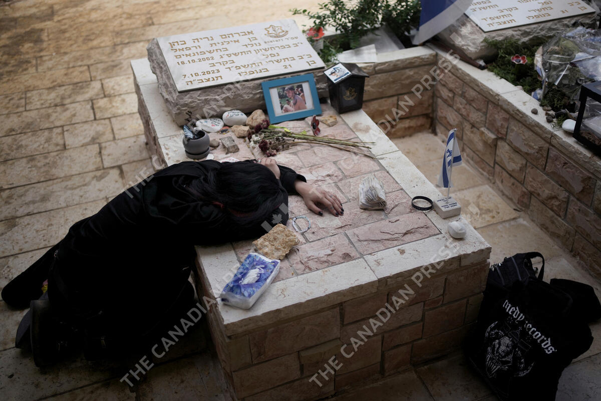Sara Chen weeps over the grave of her longtime friend, Staff Sgt. Avraham Nerya Cohen, who was killed in action on Oct. 7, 2023, as Israel marks the first anniversary of the Hamas attack on Israel, at the Mount Herzl military cemetery in Jerusalem on Oct. 7, 2024. (AP Photo/Maya Alleruzzo)