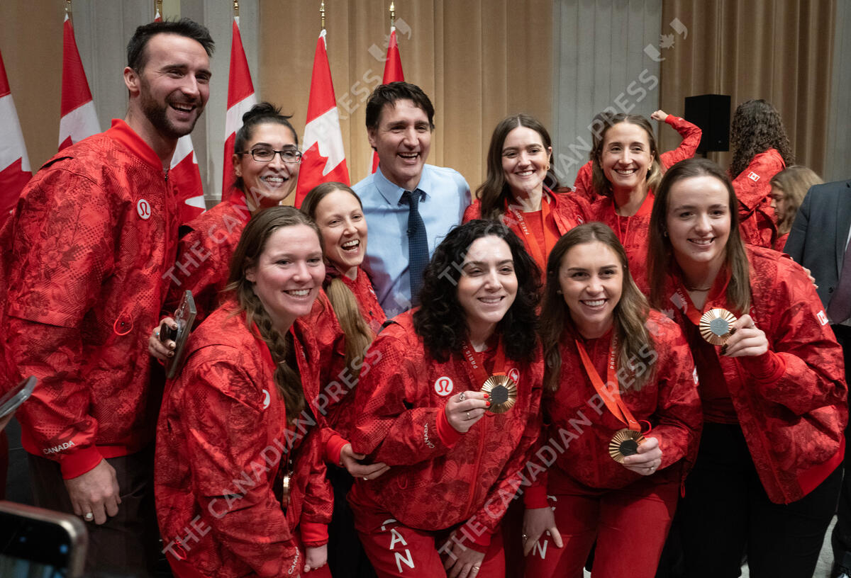 Prime Minister Justin Trudeau poses for a photo with Olympians and Paralympians during an event in the Parliamentary precinct, in Ottawa, Wednesday, Dec. 4, 2024. THE CANADIAN PRESS/Adrian Wyld