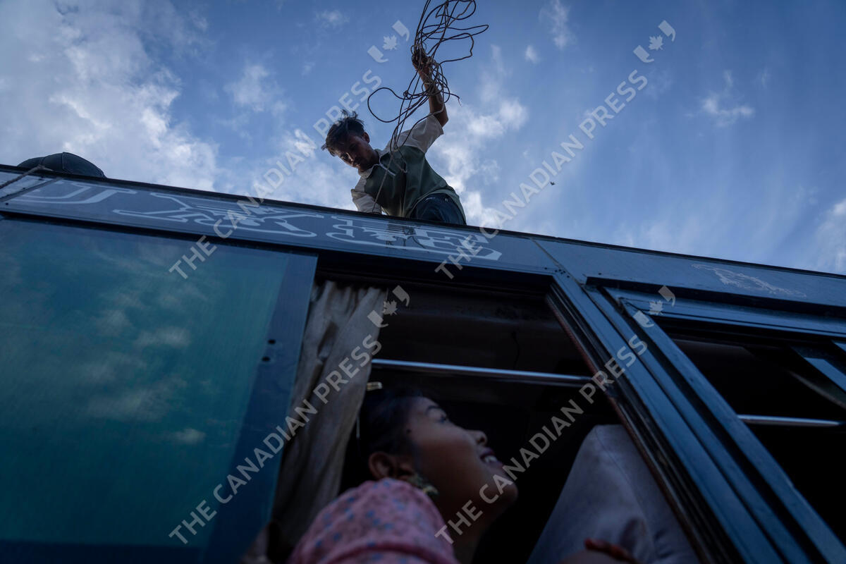 A bus staffer loads passengers' belongings at a Kathmandu station before departing for villages to celebrate the Dashain festival, in Kathmandu, Nepal, Thursday, Oct. 10, 2024. Dashain, the most important religious festival of Nepal's Hindus, commemorates the victory of the gods over demons. (AP Photo/Niranjan Shrestha)