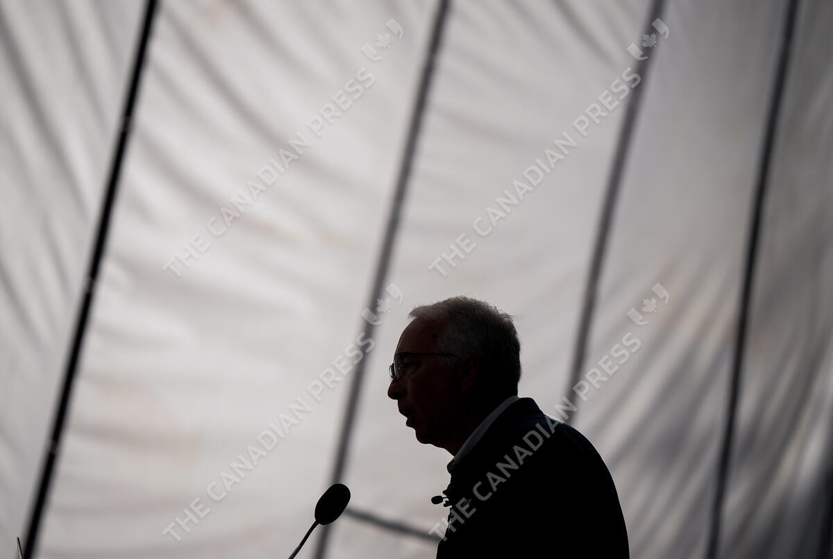 Conservative Leader John Rustad is silhouetted during a campaign stop at Seaspan Shipyards, in North Vancouver, B.C., on Thursday, October 10, 2024. THE CANADIAN PRESS/Darryl Dyck