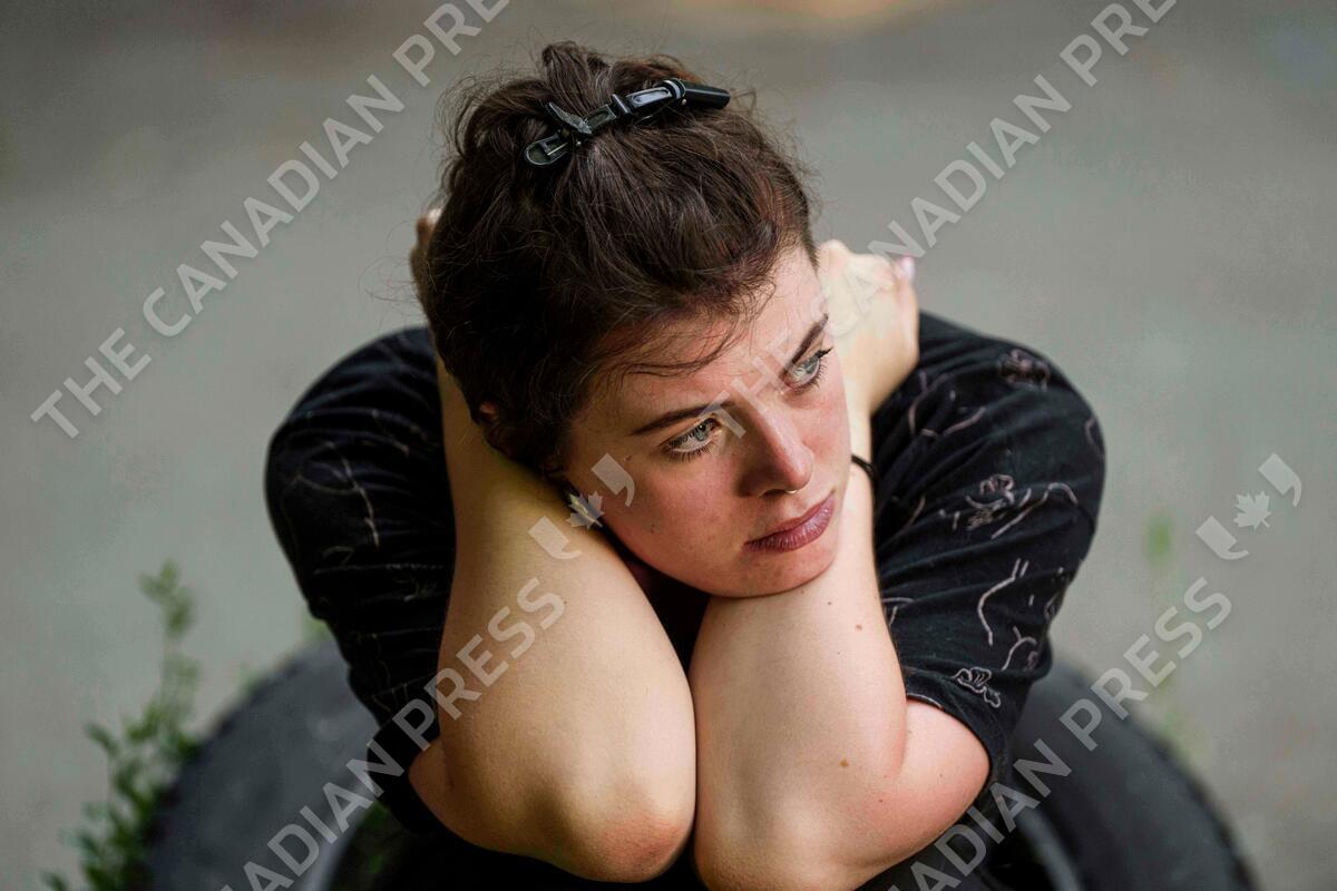 A woman sits near her residential house damaged by a Russian strike in Kyiv, Ukraine, Friday, July 4, 2025. (AP Photo/Evgeniy Maloletka)
