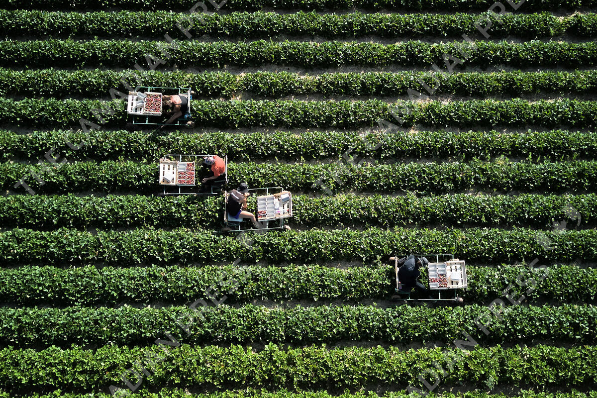 Harvest helpers harvest strawberries in a field on the outskirts of Frankfurt, Germany, Monday, June 30, 2025. (AP Photo/Michael Probst)