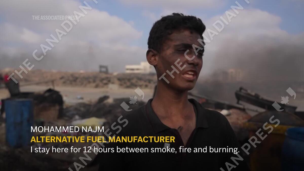 South of Gaza City, along the Sea Road that runs beside the Mediterranean, young Palestinians are producing fuel by melting plastic in makeshift burners. (AP video shot by Abdel Kareem Hana; Production by Wafaa Shurafa)