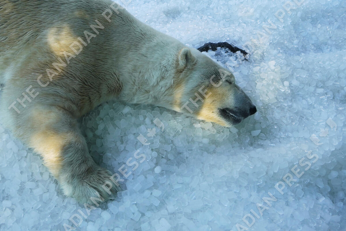 A polar bear cools down on a pile of ice that was brought to its enclosure on a hot and sunny day at the Prague zoo, Czech Republic, Tuesday, July 1, 2025. (AP Photo/Petr David Josek)