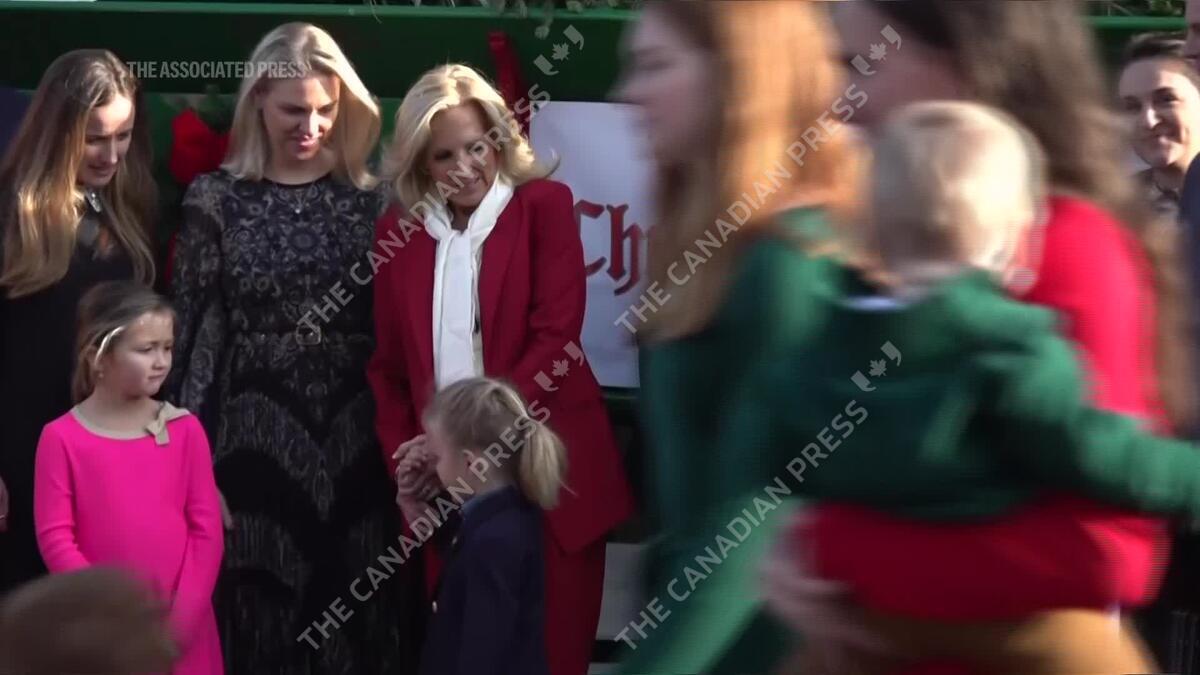 First lady Jill Biden welcomes the delivery of the official White House Christmas tree. She paid tribute to North Carolina's Cartner family for providing the "tree-mendous" Fraser Fir, despite being devastated by Hurricane Helene.