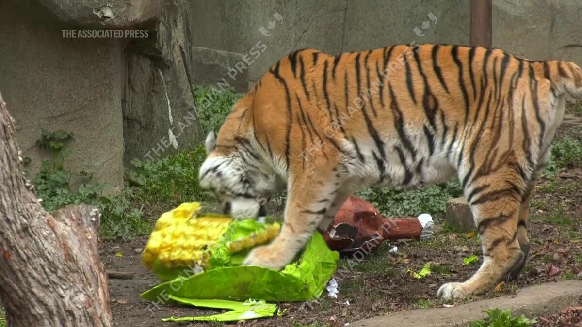 A Chicago area zoo is celebrating Thanksgiving a little early with some of its animals. The Brookfield Zoo Chicago gave an assortment of Thanksgiving themed food or food in Thanksgiving-themed containers to its goats, lions, seals and a tiger.