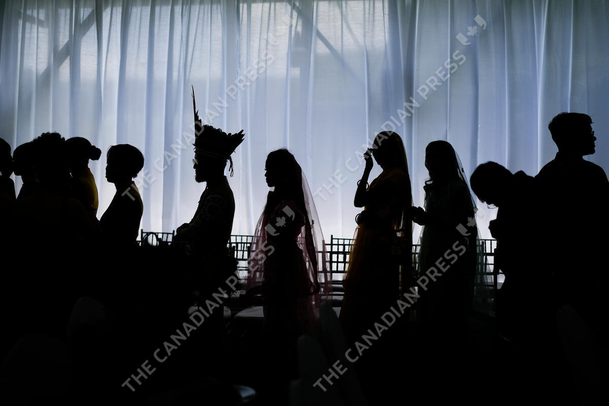 Visitors line up to eat after attending a meeting between India's Prime Minister Narendra Modi and Guyana's President Mohammed Irfaan Ali at the Government House in Georgetown, Guyana, Wednesday, Nov. 20, 2024. (AP Photo/Matias Delacroix)