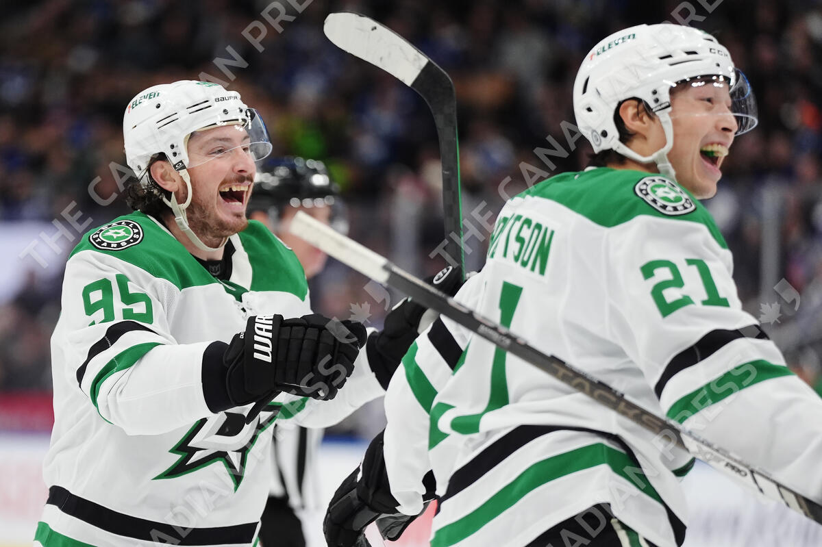 Dallas Stars' Matt Duchene (95) and Jason Robertson (21) celebrate a goal against the Toronto Maple Leafs during third period NHL hockey action in Toronto on Tuesday, January 14, 2025. THE CANADIAN PRESS/Frank Gunn