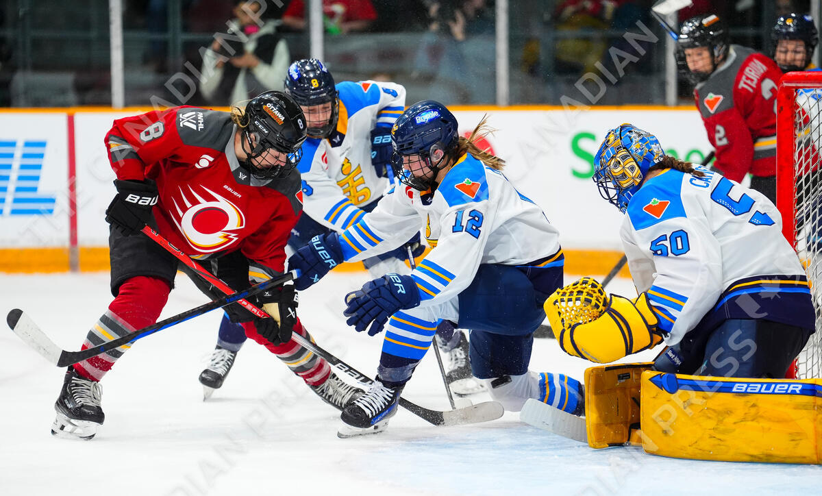 Ottawa Charge's Natalie Snodgrass (8) tries to get the puck past Toronto Sceptres' Allie Munroe (12) and goaltender Kristen Campbell (50) during third period PWHL hockey action in Ottawa on Tuesday, Jan. 14, 2025. THE CANADIAN PRESS/Sean Kilpatrick