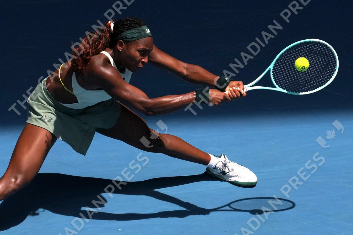 Coco Gauff of the U.S. returns a shot from Belinda Bencic of Switzerland during their fourth round match at the Australian Open tennis championship in Melbourne, Australia, Sunday, Jan. 19, 2025. (AP Photo/Mark Baker)