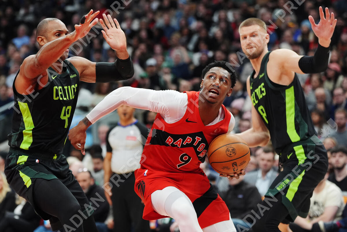 Toronto Raptors' RJ Barrett (9) drives between Boston Celtics' Al Horford (left) and Kristaps Porzingis (right) during first half NBA basketball action in Toronto on Wednesday, January 15, 2025. THE CANADIAN PRESS/Frank Gunn