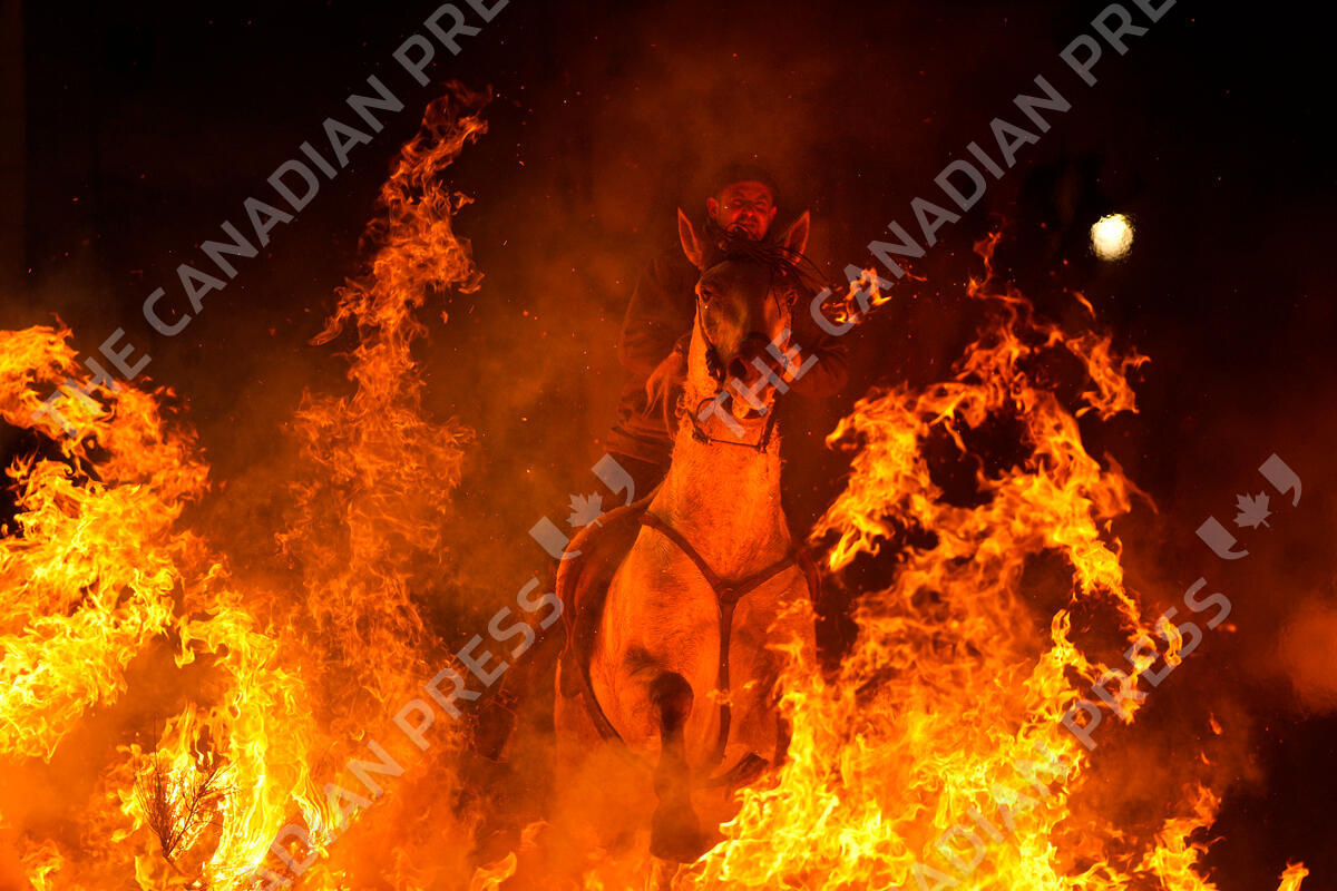 A man rides a horse through a bonfire as part of a ritual in honor of Saint Anthony the Abbot, the patron saint of domestic animals, in San Bartolome de Pinares, Spain, Thursday, Jan. 16, 2025. (AP Photo/Manu Fernandez)