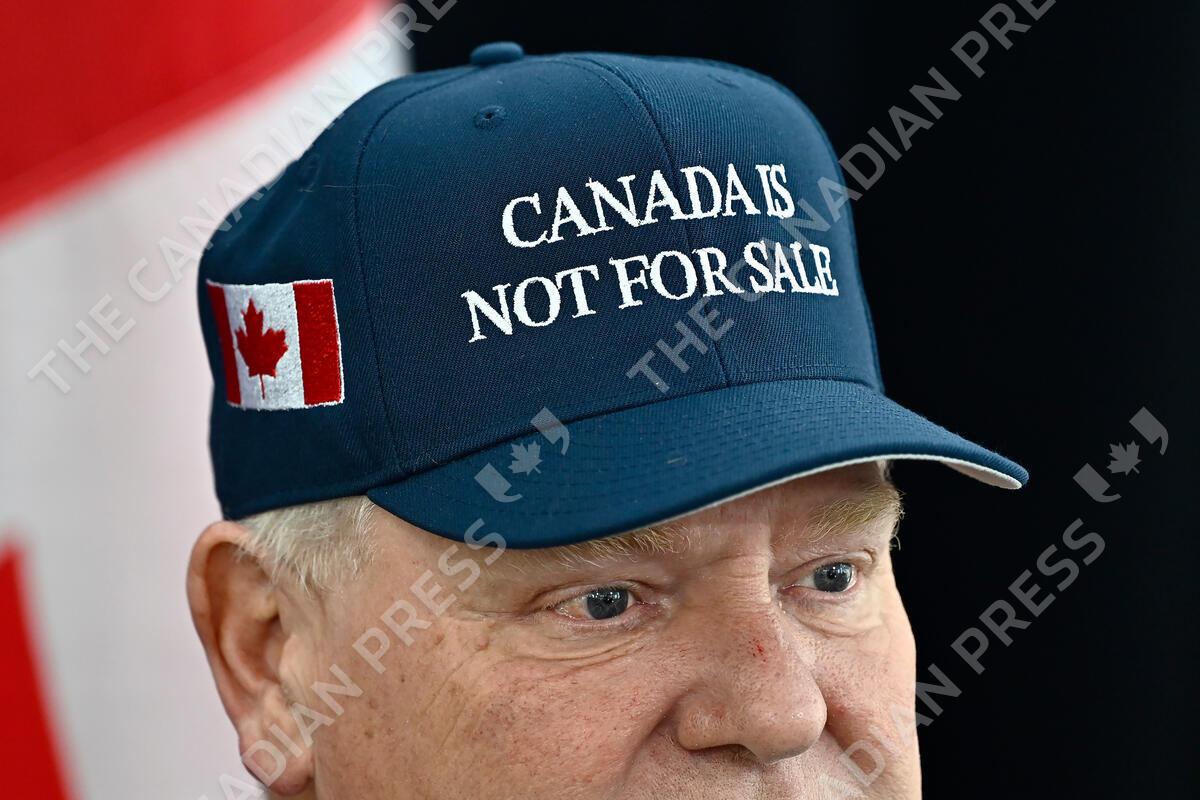 Ontario Premier Doug Ford, wearing a 'Canada Is Not For Sale' hat, speaks as he arrives for a first ministers meeting in Ottawa on Wednesday, Jan. 15, 2025. THE CANADIAN PRESS/Justin Tang