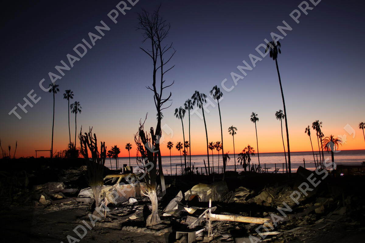 The devastation of the Palisades Fire is seen at sunset in the Pacific Palisades neighborhood of Los Angeles, Tuesday, Jan. 14, 2025. (AP Photo/Ethan Swope)