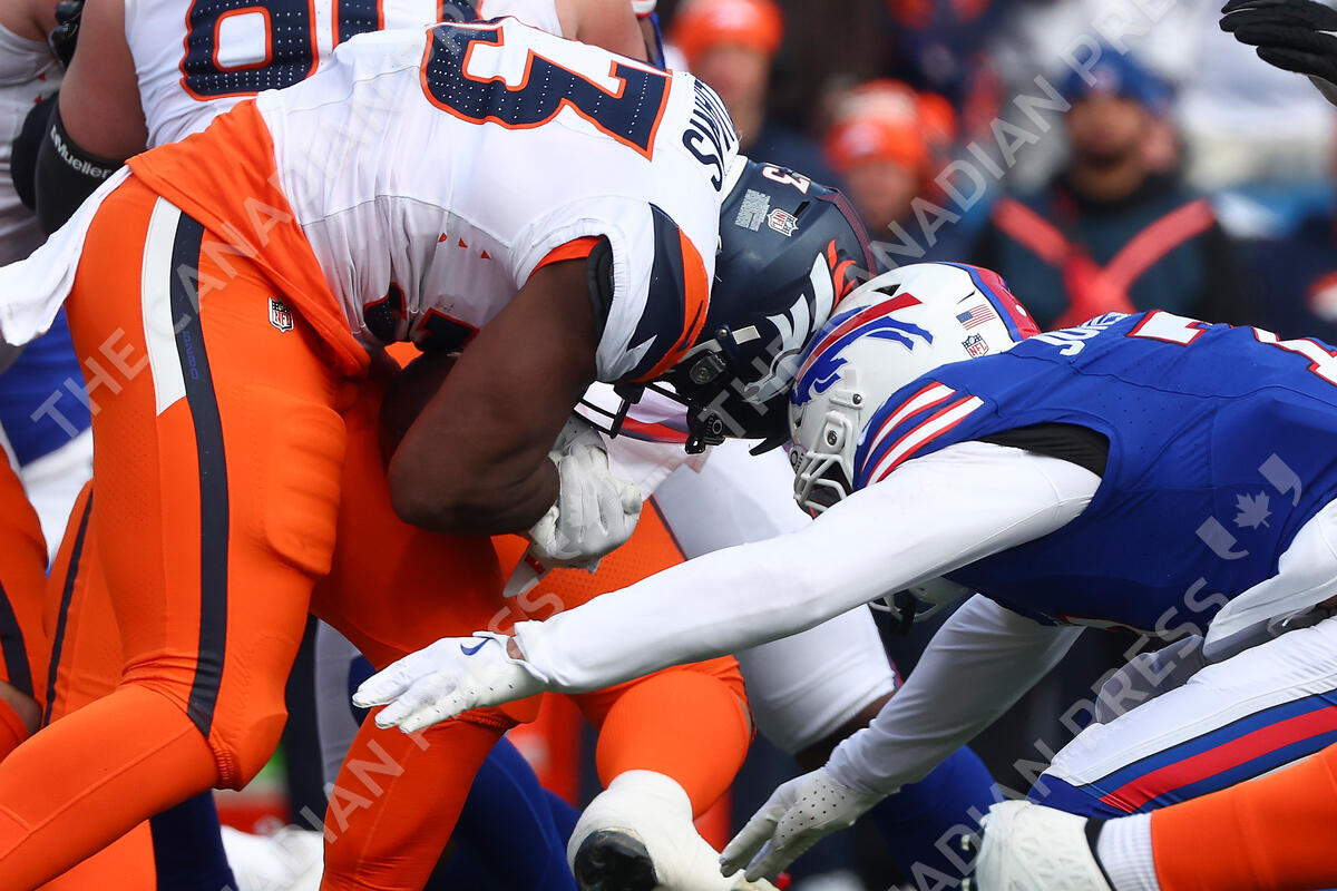 Buffalo Bills cornerback Taron Johnson (7) goes helmet to helmet on a tackle against Denver Broncos running back Javonte Williams (33) during the first quarter of an NFL wild card playoff football game, Sunday, Jan. 12, 2025, in Orchard Park, N.Y. (AP Photo/Jeffrey T. Barnes)