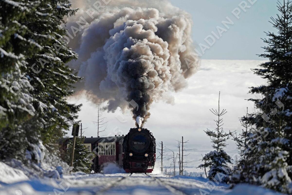 A steam train travels through the 'Harz' forest to the top of northern Germany's 1,142-meter (3,743 feet) high 'Brocken' near Schierke, Germany, Monday, Jan. 13, 2025. (AP Photo/Matthias Schrader)