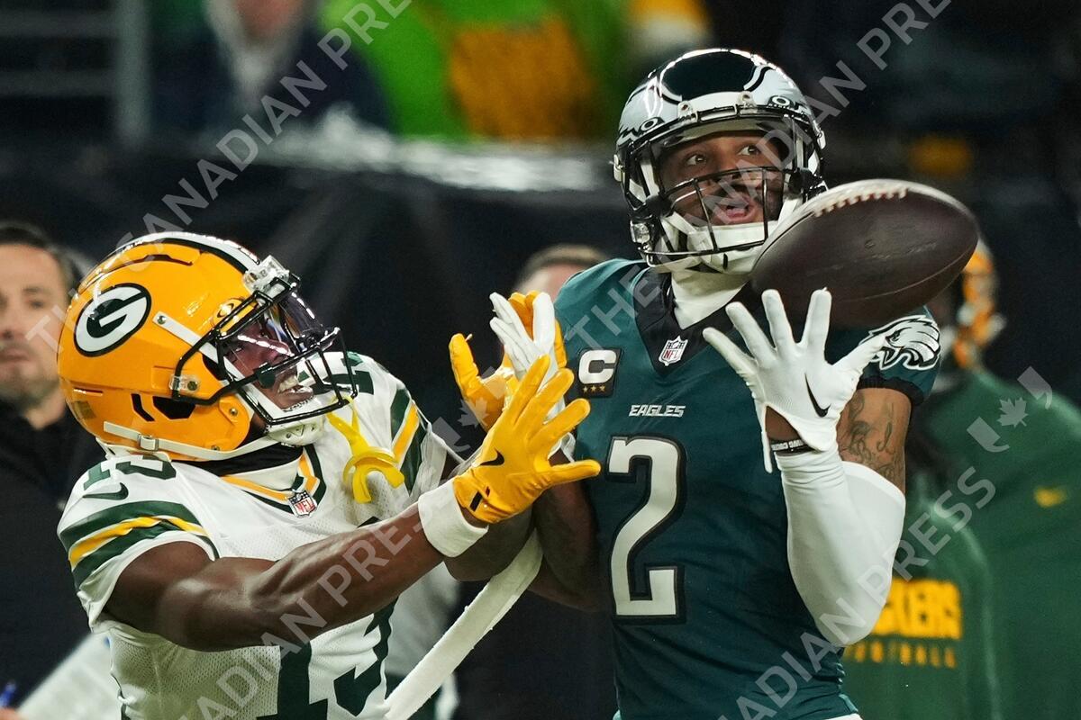 Philadelphia Eagles cornerback Darius Slay Jr. (2) intercepts a pass intended for Green Bay Packers wide receiver Dontayvion Wicks (13) during the first half of an NFL wild-card playoff football game Sunday, Jan. 12, 2025, in Philadelphia. (AP Photo/Matt Slocum)