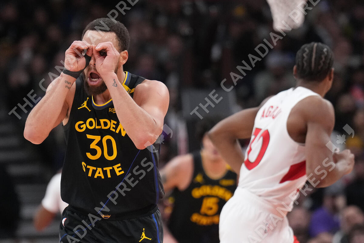 Golden State Warriors guard Stephen Curry (30) reacts after scoring during second half NBA basketball action against the Toronto Raptors, in Toronto, Monday, Jan. 13, 2025. THE CANADIAN PRESS/Nathan Denette