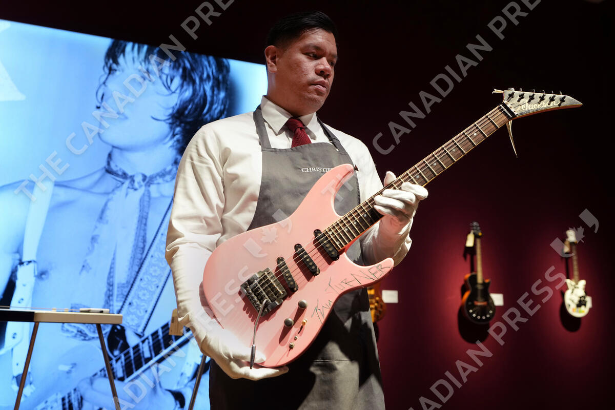 An art handler displays a Jackson, Glendora, California, 1983, a solid-body electric guitar, soloist, signed by Tina Turner, ahead of the pre-sale exhibition of Jeff Beck The Guitar Collection at Christie's auction rooms in London, Tuesday, Jan. 14, 2025. (AP Photo/Kirsty Wigglesworth)