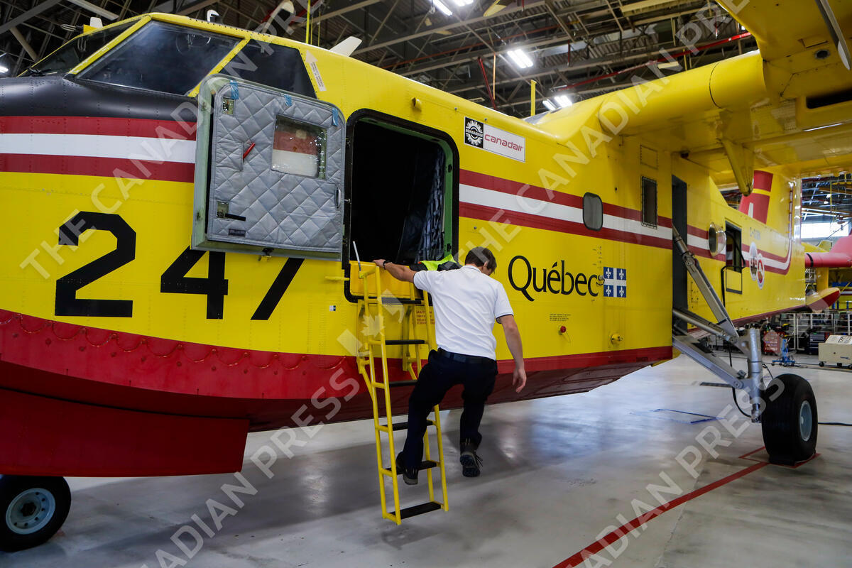 A SOPFEU pilot performs a pre-flight check of a CL-415 water bomber at the Quebec City airport, Wednesday, Jan. 15, 2025. SOPFEU is sending two more airplanes to help to fight Southern California's wildfires. THE CANADIAN PRESS/Francis Vachon