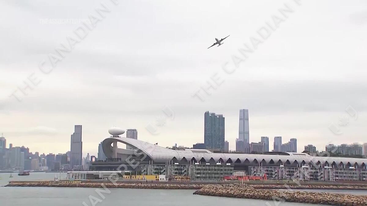 Hong Kong airline Cathay Pacific on Monday flew a passenger jet low, dipping past skyscrapers, and making a massive turn, just like planes had to do to land in Hong Kong's old airport up until 1998.