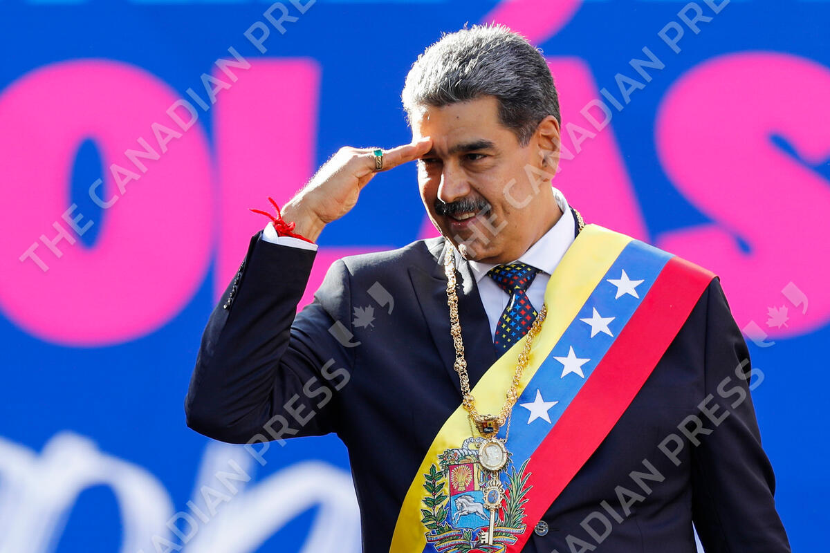 Venezuelan President Nicolas Maduro salutes supporters on his inauguration day for a third term at Miraflores presidential palace in Caracas, Venezuela, Jan. 10, 2025. (AP Photo/Cristian Hernandez)