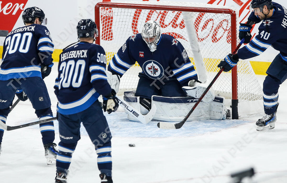 All Winnipeg Jets players wear 300 and goaltender Connor Hellebuyck's name on their jerseys to celebrate Hellebuyck's 300th win, 500 regular season games and 40th shutout during warm up prior to their game against the Los Angeles Kings in NHL action in Winnipeg on Friday, January 10, 2025. THE CANADIAN PRESS/John Woods