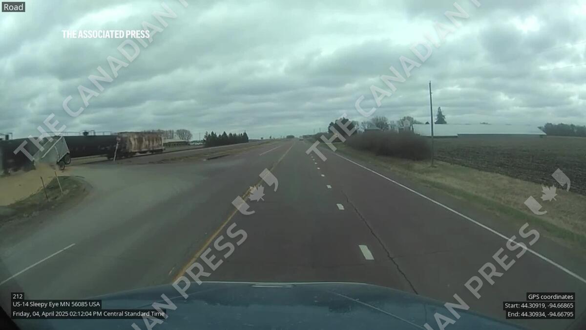 Dash cam video captured a dramatic crash between a grain truck and a freight train near Sleepy Eye, Minnesota on April 4. The truck driver and two train occupants were treated at the scene for minor injuries.