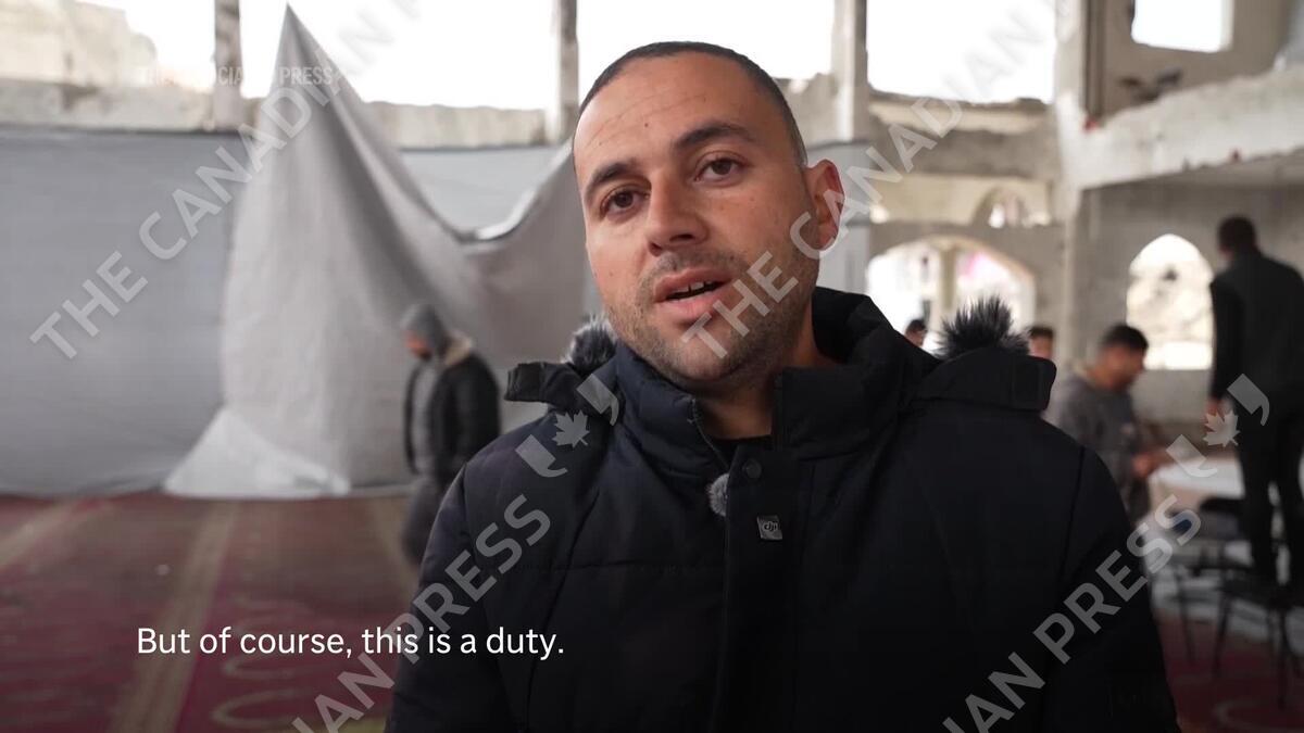 People gathered for communal prayers in the shattered concrete husk of Gaza City's Imam Shafi’i Mosque during the first Friday prayers of Ramadan. (AP video shot by Abdel Kareem Hana)