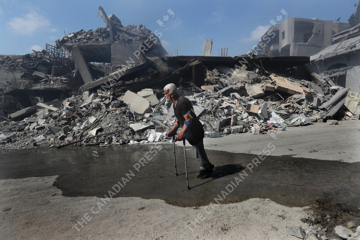 A man walks in front of destroyed buildings on a commercial street that was hit Saturday night by Israeli airstrikes, in Nabatiyeh town, south Lebanon, Sunday, Oct. 13, 2024. (AP Photo/Mohammed Zaatari)