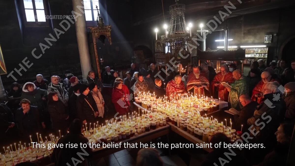 Orthodox Christians in Bulgaria are observing the Day of Saint Haralambos, the patron saint of beekeepers. The traditional religious festival pays homage to honeybees and their precious product and dozens of worshippers flock to a church where they light candles on jars of honey and pray for protection and health. (AP video/Valentina Petrova)