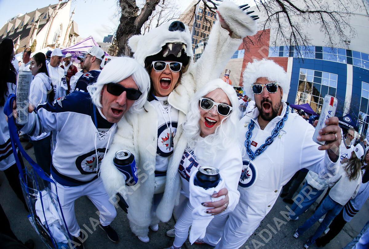 Winnipeg Jets fans Eddie, Charlene, Jenna and Erik get warmed up at the White Out Party before the Winnipeg Jets meet the St. Louis Blues in game one of NHL playoff action in Winnipeg on Saturday, April 19, 2025. THE CANADIAN PRESS/John Woods
