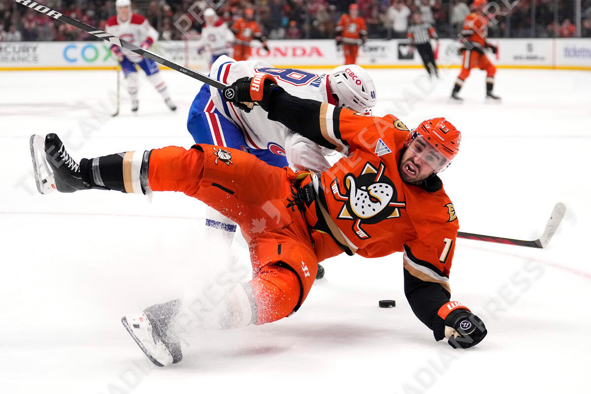 Anaheim Ducks center Robby Fabbri, right, falls as he battles for the puck with Montreal Canadiens defenseman Lane Hutson during the third period of an NHL hockey game, Sunday, Feb. 2, 2025, in Anaheim, Calif. (AP Photo/Mark J. Terrill)