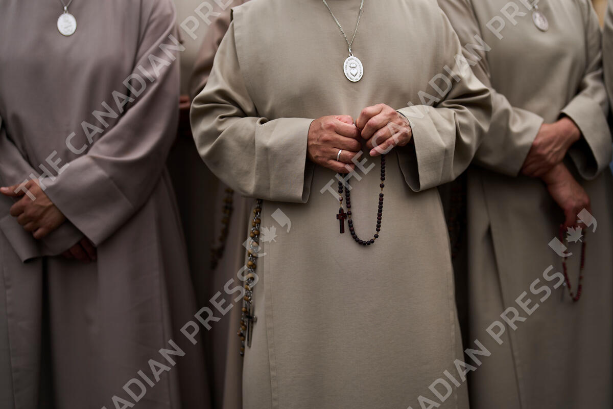 Nuns hold rosaries as Pope Leo XIV appears at the central balcony of St. Peter's Basilica for his first Sunday blessing after his election, in St. Peter's Square at the Vatican, Sunday, May 11, 2025.(AP Photo/Bernat Armangue)