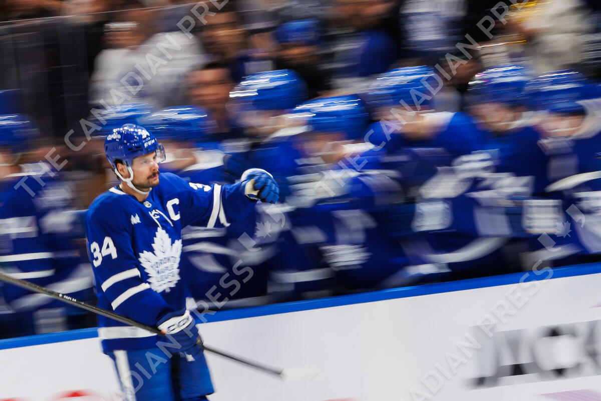 Toronto Maple Leafs' Auston Matthews (34) celebrates a goal with the bench during first period NHL hockey action against the Tampa Bay Lightning, in Toronto, Monday, Jan. 20, 2025. THE CANADIAN PRESS/Cole Burston
