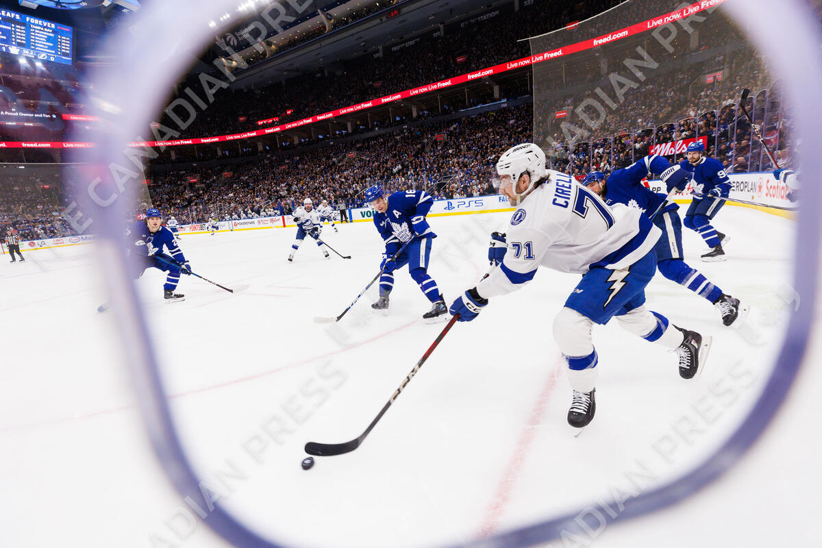 Tampa Bay Lightning's Anthony Cirelli (71) skates with the puck during first period NHL hockey action against the Toronto Maple Leafs, in Toronto, Monday, Jan. 20, 2025. THE CANADIAN PRESS/Cole Burston