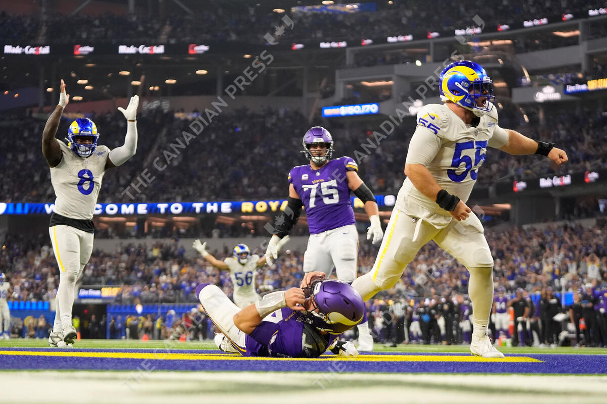 Minnesota Vikings quarterback Sam Darnold (14) lays on the ground after being sacked for a safety by Los Angeles Rams linebacker Byron Young (0) (not pictured) during the second half of an NFL football game, Thursday, Oct. 24, 2024, in Inglewood, Calif. (AP Photo/Mark J. Terrill)