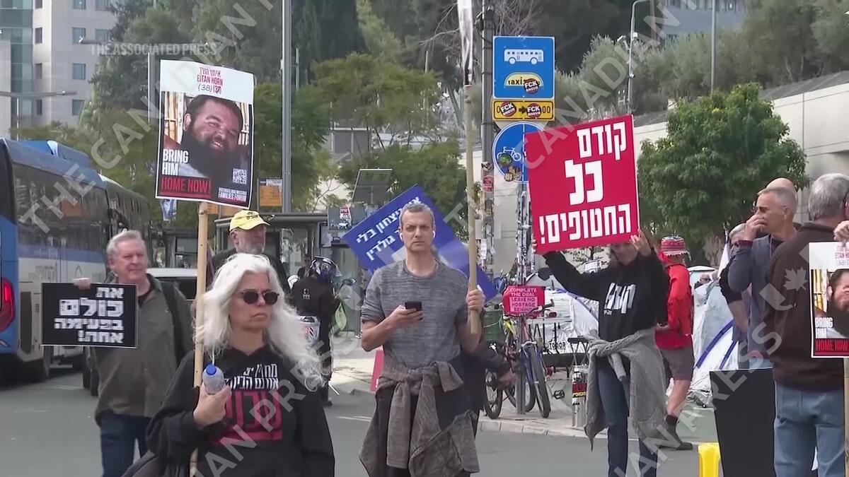 Some relatives of hostages and their supporters woke up outside the Defense Ministry in Tel Aviv on Sunday, after sleeping in tents there. They demanded an immediate ceasefire in Gaza that would enable all the remaining hostages to be released. (AP video: Ami Bentov)