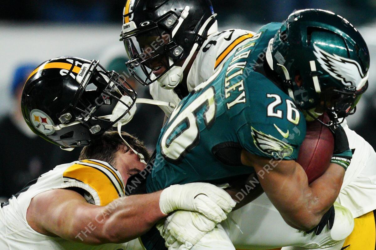 Philadelphia Eagles running back Saquon Barkley (26) is tackled by Pittsburgh Steelers defensive tackle Dean Lowry (94) as he loses his helmet during the second half of an NFL football game Sunday, Dec. 15, 2024, in Philadelphia. (AP Photo/Derik Hamilton)