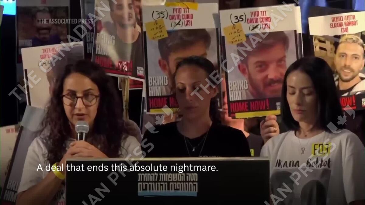 Relatives and supporters gathered for a weekly rally in the Israeli city of Tel Aviv on Saturday, demanding a ceasefire and a deal to return the remaining hostages held in Gaza. "For us, there is only one victory, only one path to recovery: a deal that brings back all the hostages. A deal that ends this absolute nightmare," said Aloni Cunio, the wife of released hostage David Cunio. (AP Video: Shlomo Mor)