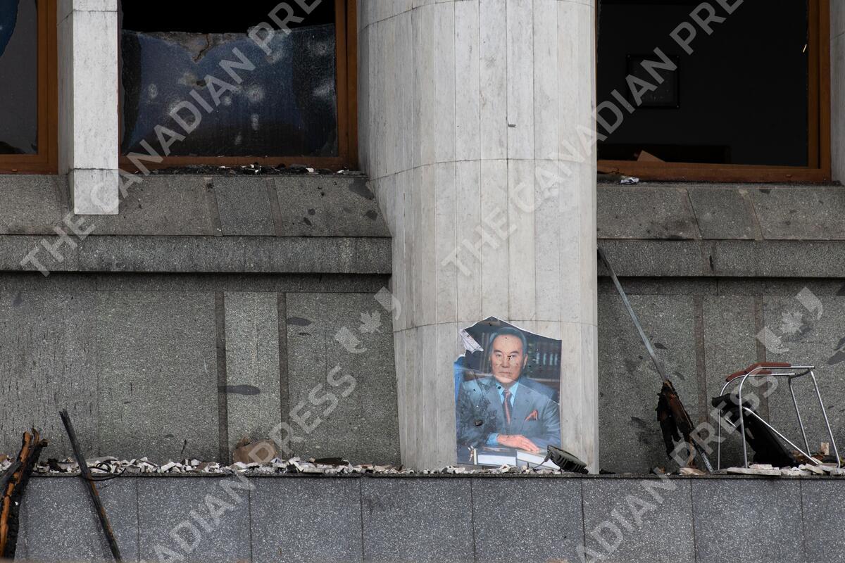 A portrait of former Kazakhstan President Nursultan Nazarbayev is seen at the city hall building after clashes in the central square blocked by Kazakhstan troops and police in Almaty, Kazakhstan, Monday, Jan. 10, 2022. The National Security Committee, Kazakhstan's counterintelligence and anti-terrorism agency, said that the situation in the country has "stabilized and is under control." (AP Photo/Vasily Krestyaninov)