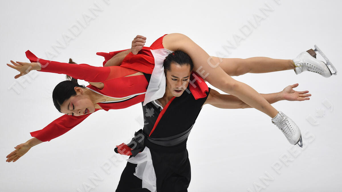 Kana Muramoto and Daisuke Takanashi of Japan perform their ice dance free dance skating program during the ISU Four Continents Figure Skating Championships in Tallinn, Estonia, Thursday, Jan. 20, 2022. (AP Photo/Sergei Stepanov)