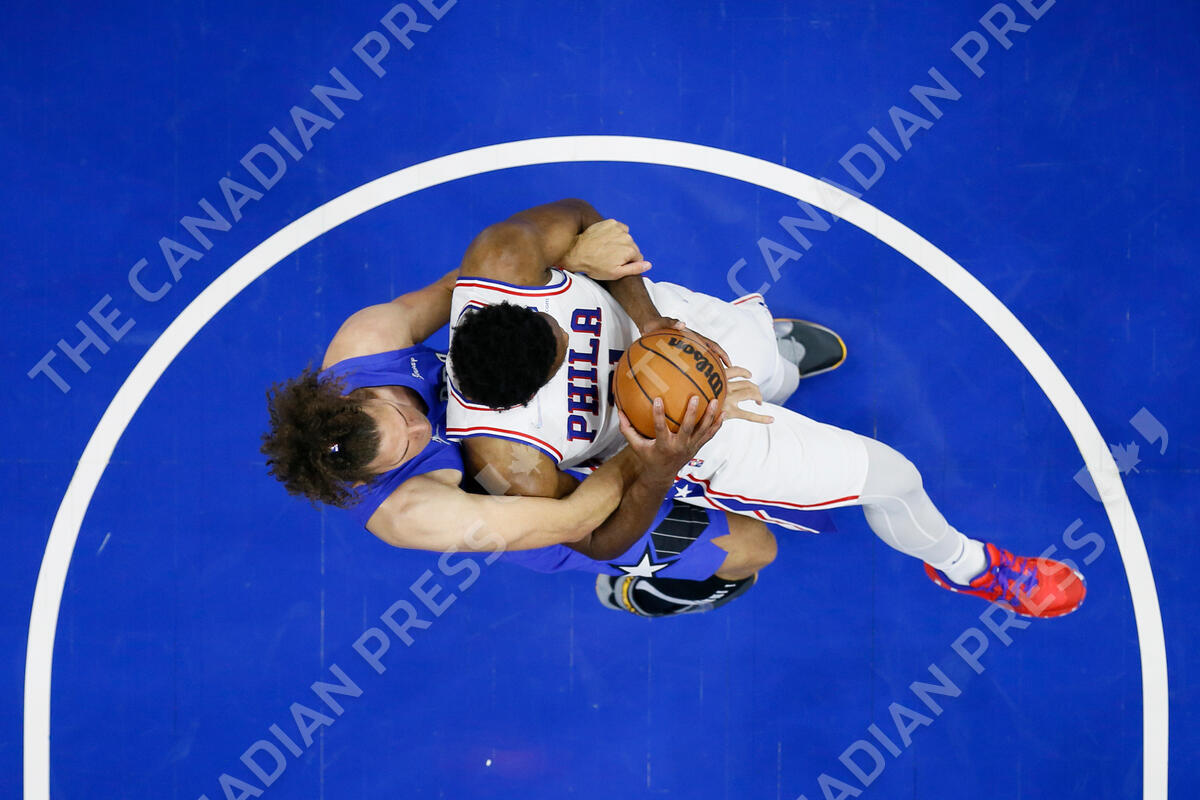 Philadelphia 76ers' Joel Embiid, right, is fouled by Orlando Magic's Robin Lopez during the second half of an NBA basketball game, Wednesday, Jan. 19, 2022, in Philadelphia. (AP Photo/Matt Slocum)