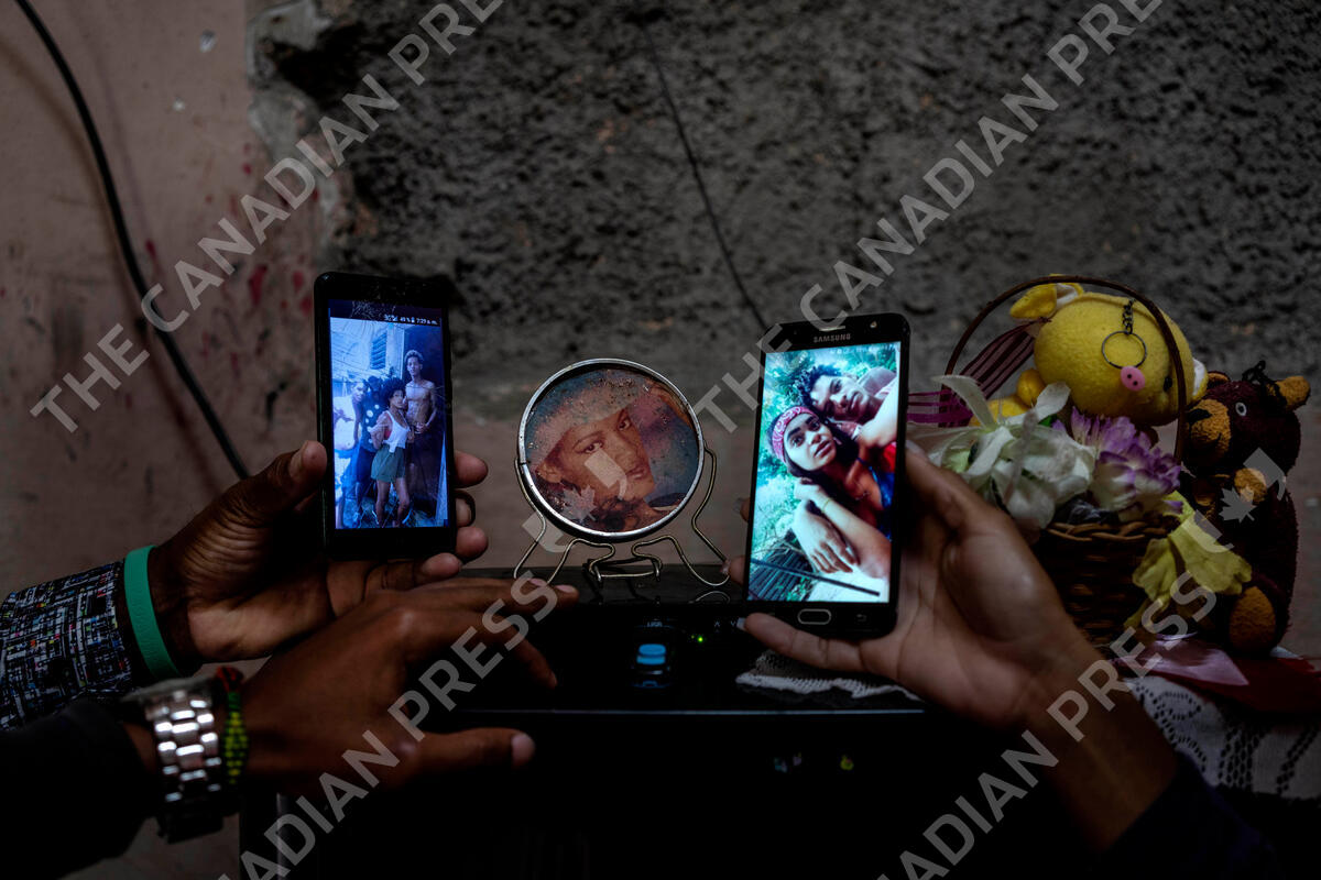 Relatives show photos of the three Roman siblings who are in prison accused of participating in anti-government protests, at their home in the La Guinera neighborhood of Havana, Cuba, Wednesday, Jan. 19, 2022. Six months after surprising protests against the Cuban government, more than 50 protesters charged with sedition are headed to trial and could face prison sentences up to 30 years. (AP Photo/Ramon Espinosa)