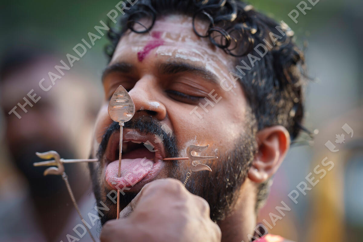 A Hindu devotee gets his tongue pierced with a metal rod during the Thaipusam festival as devotees comply with strict standard operating procedures due to the COVID-19 pandemic at Batu Caves on the outskirts of Kuala Lumpur, Malaysia, Tuesday, Jan. 18, 2022. Thaipusam, which is celebrated in honor of Hindu god Lord Murugan, is an annual procession by Hindu devotees seeking blessings, fulfilling vows and offering thanks. (AP Photo/Vincent Thian)