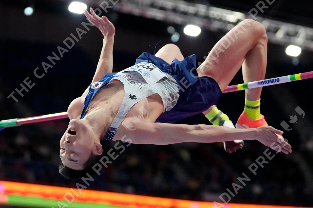 Woo Sanghyeok, of South Korea, makes an attempt in the Men's high jump at the World Athletics Indoor Championships in Belgrade, Serbia, Sunday, March 20, 2022. (AP Photo/Darko Vojinovic)